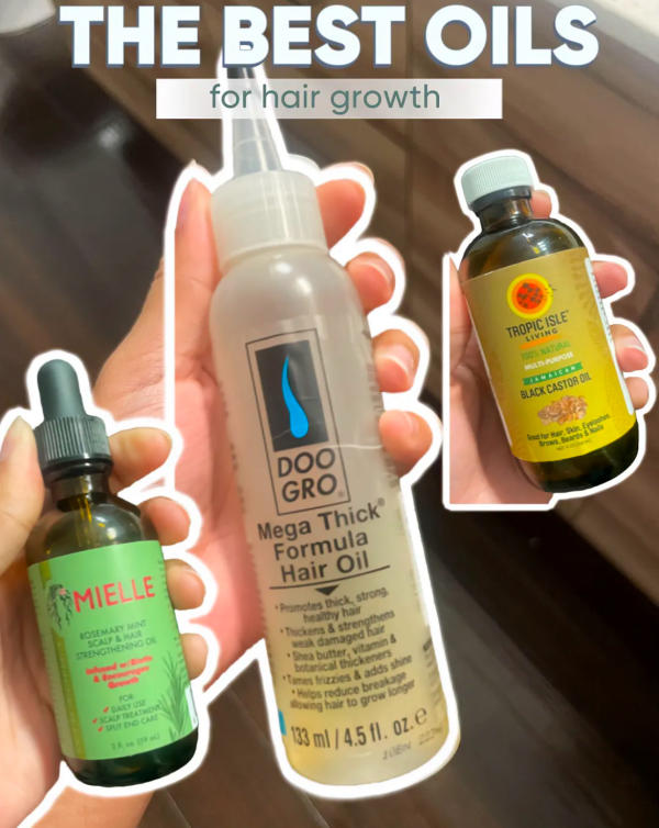 Here are my top three picks that I like to mix together for maximum hair growth benefits. I apply the blend 2–3 times a week before washing my hair, letting it soak for 30–60 minutes!