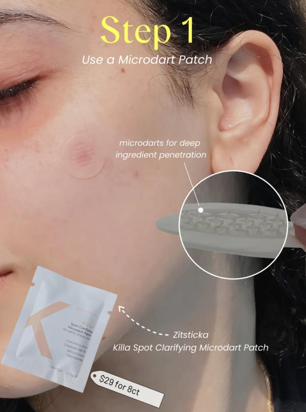 Traditional pimple patches can help with surface-level blemishes, but microdart patches go a step further. They contain tiny “darts” that deliver active ingredients like salicylic acid and niacinamide directly into the breakout, working deeper than a regular patch. The Zitsticka Killa Spot Clarifying Microdart Patches are a great option—easy to use and only cause a slight pinch upon application. They help flatten pimples quickly so they’re less noticeable under makeup.