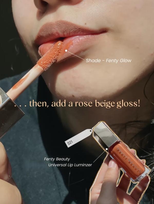 Lip gloss lovers will appreciate this formula for its comfortable wear and glass-like shine. It has shimmer without any gritty texture, stays put impressively well, and adds a luminous effect that catches the light in just the right way. The shade fenty glow, a soft rose, layers seamlessly over the Charlotte Tilbury liner to create a hazelnut-toned lip look that feels polished yet effortless.