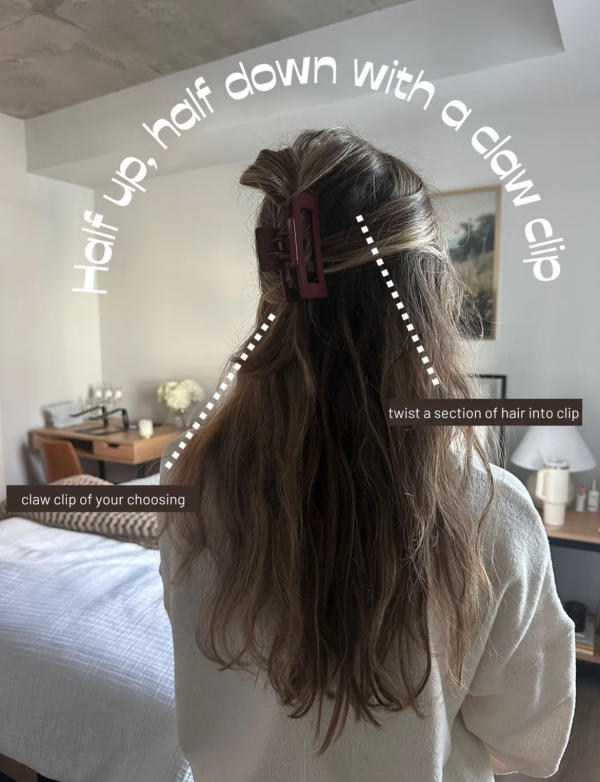 This style strikes the perfect balance between casual and chic. Pulling the top half of your hair into a small bun secured with a claw clip keeps strands away from your face while still letting the rest flow freely. It gives off a soft, feminine aesthetic and is ideal for busy days when you want to look cute without much effort.