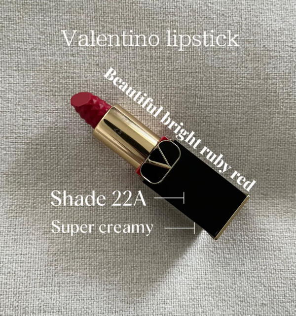If you’re looking for a luxurious red with a rich, ruby undertone, Valentino’s Lipstick in 22A is the one. This shade offers a bold yet elegant look that feels perfect for both day and night wear. The creamy formula glides smoothly across the lips, providing full coverage and a radiant finish. Beyond the formula, the packaging itself feels like a statement piece — sleek, stylish, and sophisticated, making it a joy to pull out of your bag for touch-ups.
