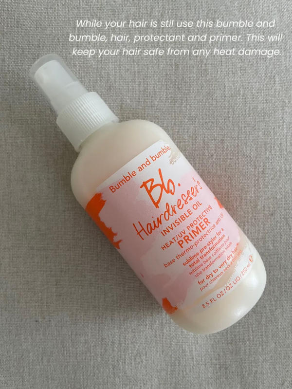 After washing your hair and while it’s still damp, the first step is to apply the Bumble and Bumble Hair Primer & Protector. This product works wonders by shielding your hair from heat damage while making it easier to style. It helps create a smooth foundation, ensuring your strands stay soft and manageable once the heat tools come into play.