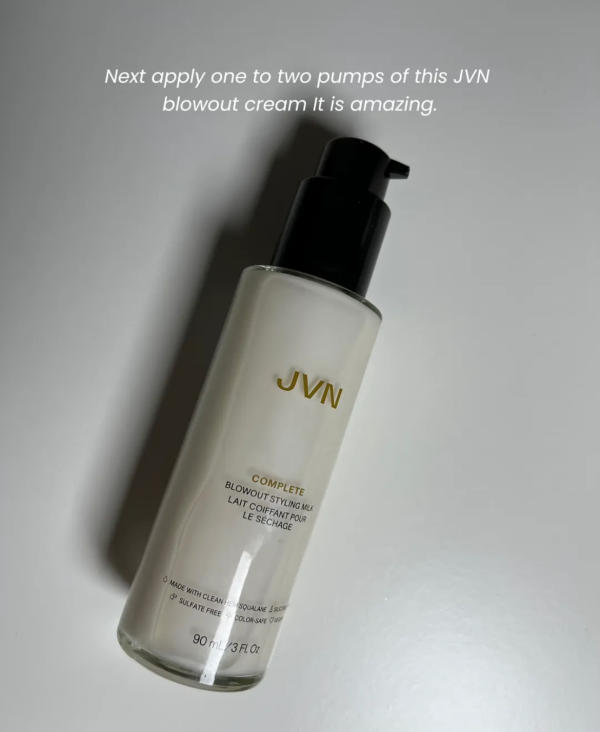 Next up, apply the JVN Blowout Cream. This product is a game changer for anyone who loves that voluminous, salon-quality finish. It helps smooth the hair cuticle, adds shine, and provides long-lasting hold without feeling heavy or greasy. It’s available on Amazon or through the official JVN website and retails for around $30. I use it every time I blow-dry my hair — it truly makes a visible difference.