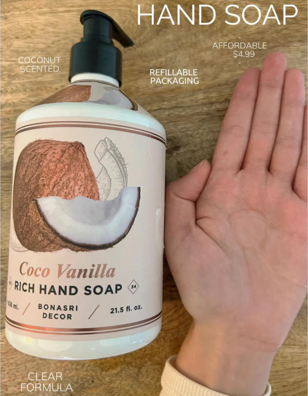 I also found a cute hand soap dispenser with a coconut-vanilla scent. Not only is it wonderfully fragrant, but it's also sustainable—refillable so you can reuse it instead of buying a new bottle each time. A simple and eco-friendly addition to my bathroom!
