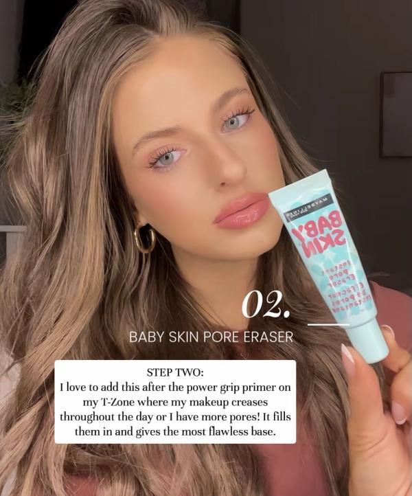 The Baby Skin Pore Eraser works alongside the Power Grip Primer to create an even, flawless surface. It fills in fine lines and blurs pores, giving the skin a soft-focus finish before applying foundation. Using it as a second layer ensures that makeup glides on evenly and looks polished for hours without settling into imperfections.