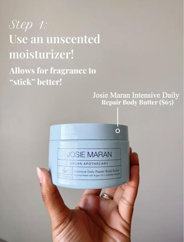 Hydrated skin holds fragrance better, which is why this step matters so much. Using a rich, unscented body butter creates the perfect base without competing with your perfume. Well-moisturized skin helps fragrance oils cling rather than disappear, allowing the scent to stay noticeable for much longer.